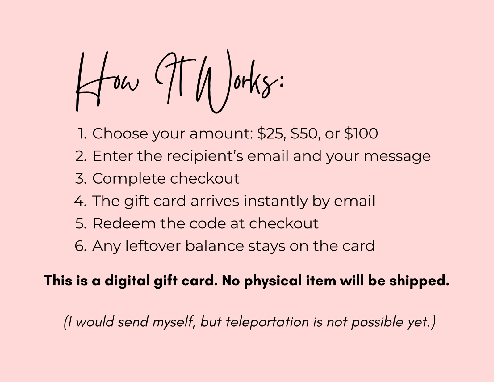 Please note: Gift cards are delivered digitally and do not count toward the free shipping minimum. Free shipping applies to physical merchandise totals only. Discount codes cannot be applied to gift card purchases. All gift card sales are final and non-refundable.
